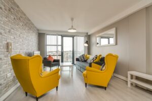 In our apartments in Belfast, you will see the previously spoken about apartment, with vibrant yellow doors combining an industrial with a grey modern vibe-made to create a ‘home from home’ environment that is engaging, fun, Instagrammable, whilst also being an easy to clean and maintain space.